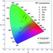 Photoluminescence shows the materials emit with different colours when changing the host lattice between Y2 O2 S and Gd2 O2 S. The yttrium version spans the blue to green colours whereas the gadolinium version only manifest greens.