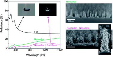 Hierarchically nanostructured Si surfaces having nanopillars covered with AlOOH nanoflakes improve antireflectance and superhydrophobicity.