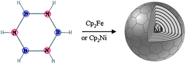 Fe and Ni NP-core multilayer crystallized BN spheres embedded in amorphous BN were synthesized from borazine containing ferrocene or nickelocene.
